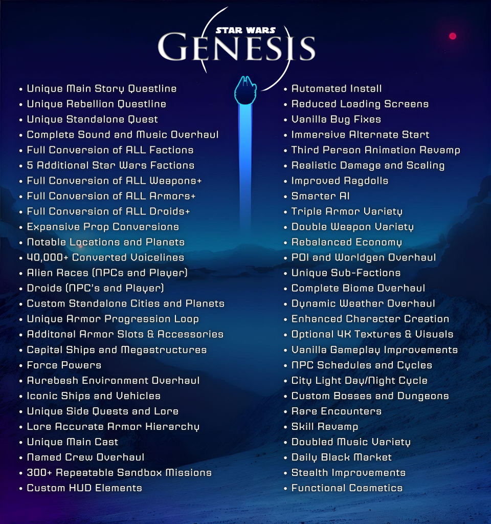 Star Wars Genesis is a free, fan-made, total conversion modlist for Starfield. It is created with a deep love and appreciation for Star Wars as a whole, and attempts to bring fans in a divided community together to enjoy Star Wars for what it is. It is not meant to put down or go against any other Star Wars game or media, and I have no desire to make it ever cost money or look to make a profit from it. In fact, I am very much at a monetary loss in this endeavor.