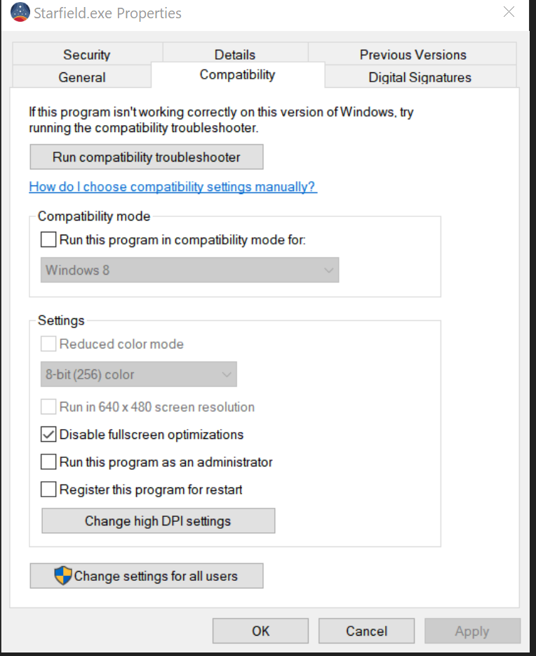 - Disable Full Screen Optimizations in Starfield.exe