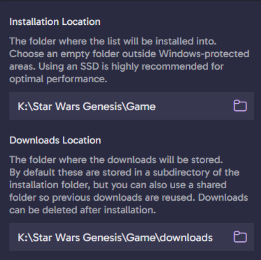 Note: It is a common mistake to set the installation location to just the \Star Wars Genesis folder and not the \Star Wars Genesis\Game folder. If you do that, you will get an error saying you can’t install to the same place as your Wabbajack compiler.